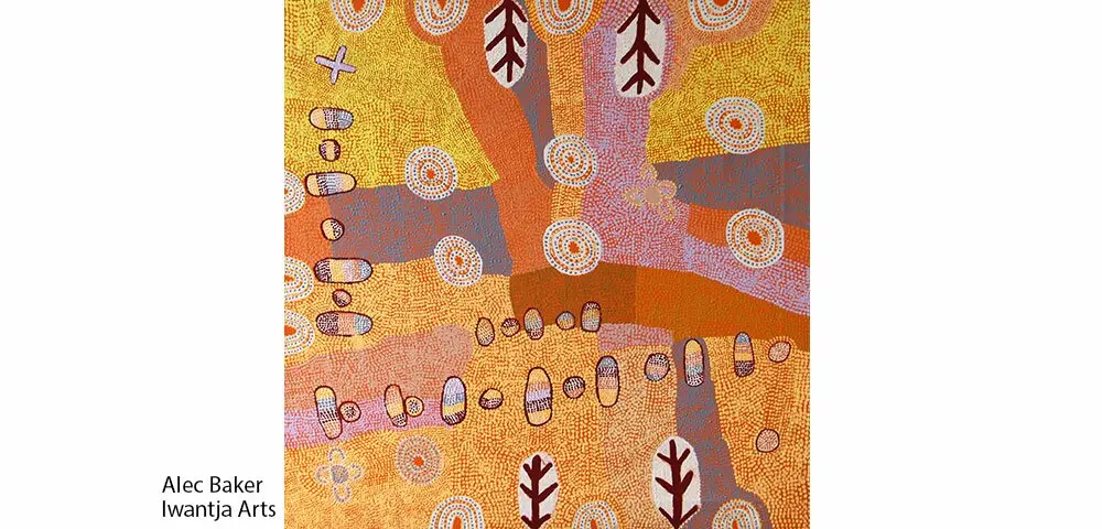 Iwantja Creek marks the place where Tjurki, the owl, rested on his travels. The community grew up nearby on what was an excision of Granite Downs cattle Station, some eight kiometres from the Stuart highway. Iwantja Arts started in the early 1980s when a committed group of artists travelled to Canberra to advocate for the development of the art centre. Like other APY art centres, early work included traditional wood carving (punu), batik, patchwork, tie-dying and painting. Iwantja became well known for print making. The art centre today provides professional development for a number of artists with clearly individual styles.
