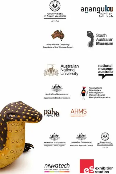 The Ngintaka Exhibition at the South Australian Museum was presented by Ananguku Arts and Culture Aboriginal Corporation with the Songlines of the Western Desert ARC Project. Partners in the Songlines Project are the Australian National University, Ngaanyatjarra Pitjantjatjara Yankunytjatjara Women's Council, the National Museum of Australia, the Palya Fund and the Department of Sustainability, Environment, Water and Communities, and Ananguku Arts. The exhibition is supported by Arts SA and the South Australian Museum.