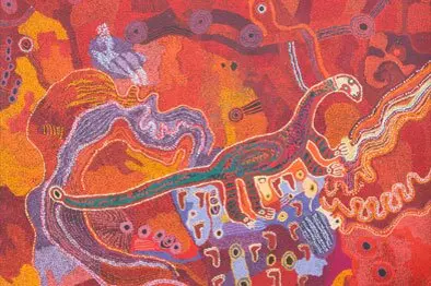 The exhibition tells the story of the giant Wati Ngintaka, the Perentie Lizard man, who travels across the APY Lands creating landforms and food sources in his epic quest for a superior grindstone. In 1988 Traditional Owners decided to share the open version of this story with a wider non-Indigenous audience.